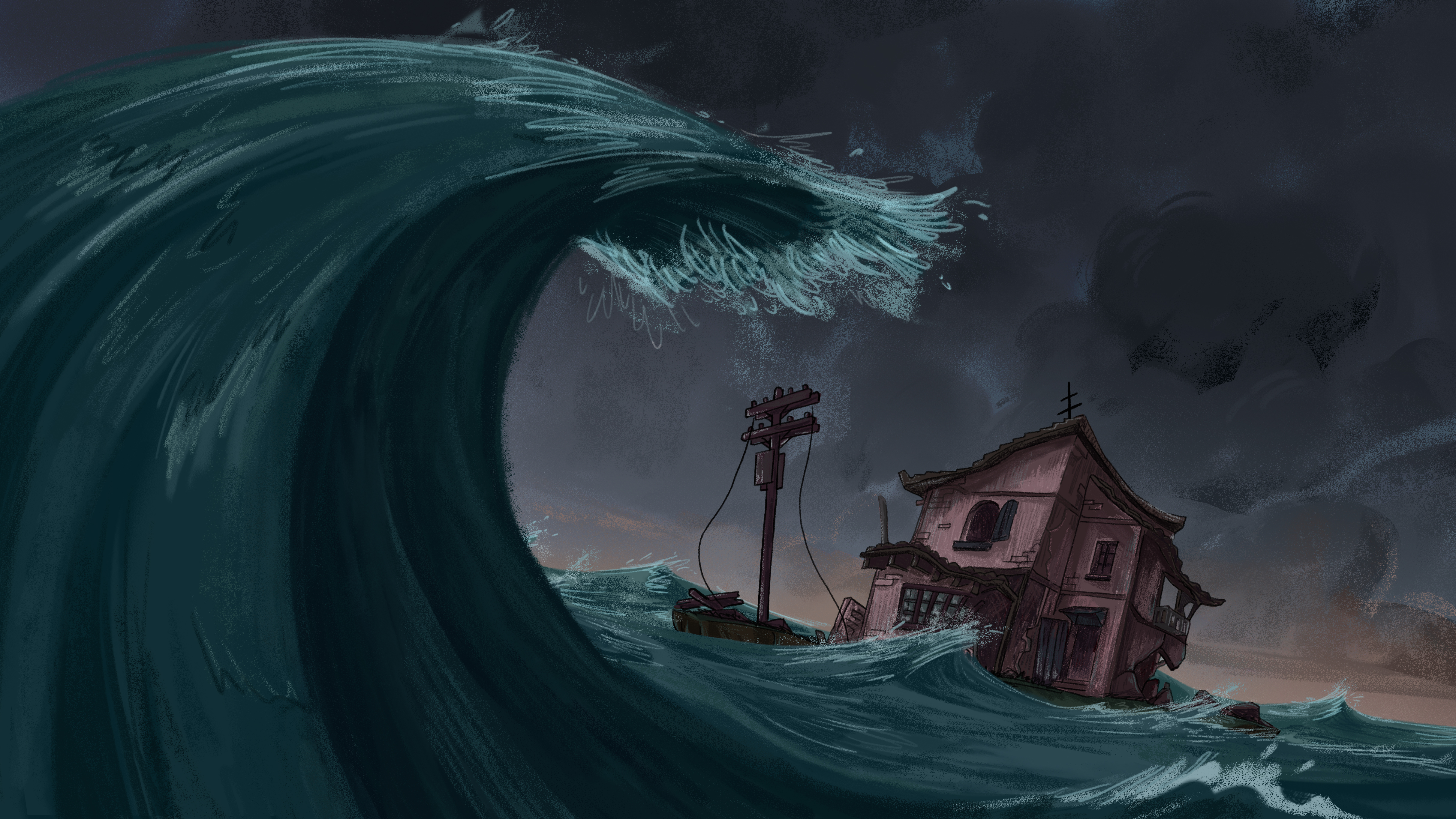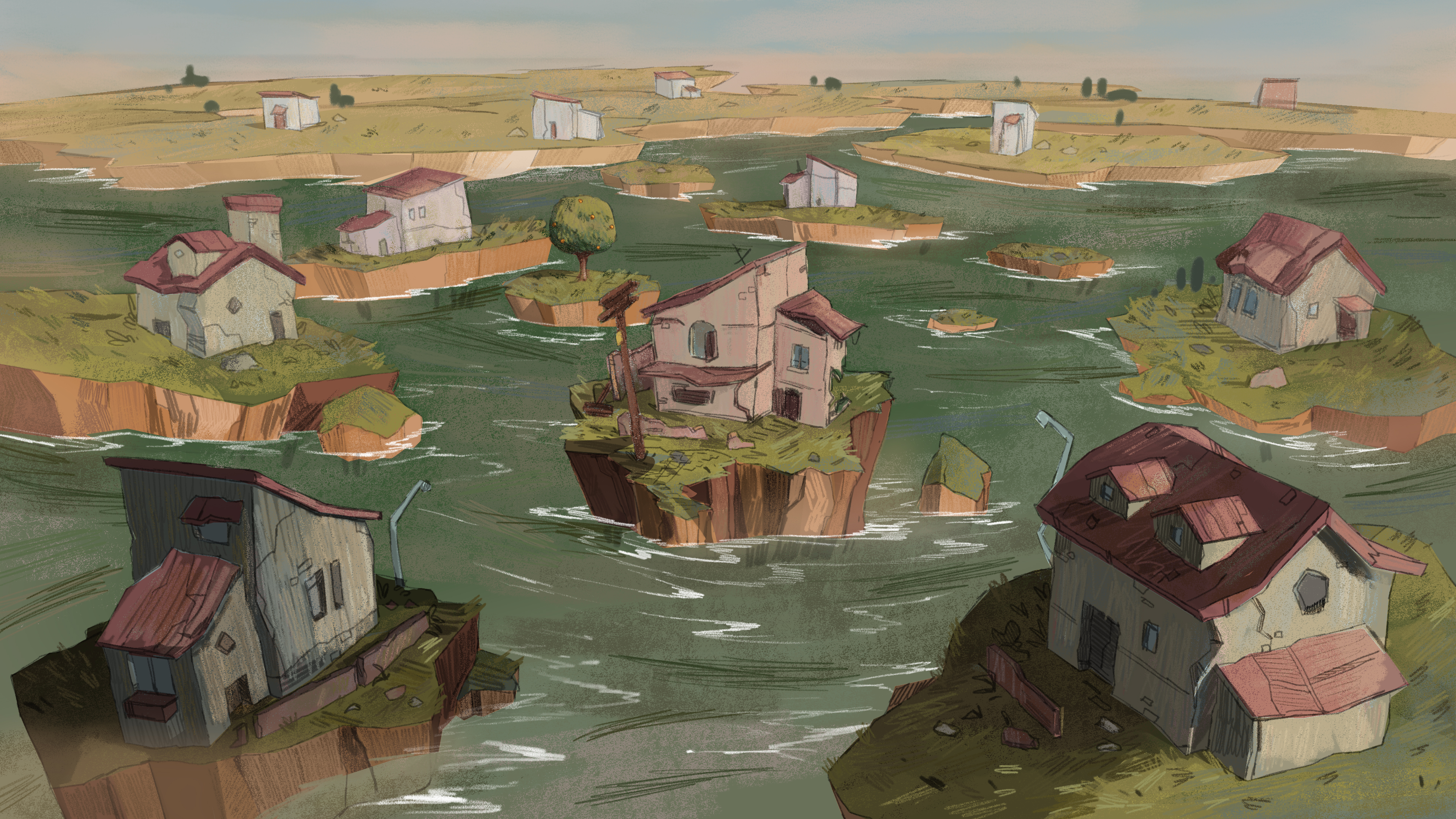 Maya Sanbar has created a gorgeous and haunting world in Footsteps on the Wind. It has the feeling of a nostalgic childhood cartoon that morphs into a larger world to tell an important story. The film tells the story of a family (father, mother, brother, and sister) who are torn apart due to a variety of natural disasters. The children are then left to survive on their own with no one but each other.