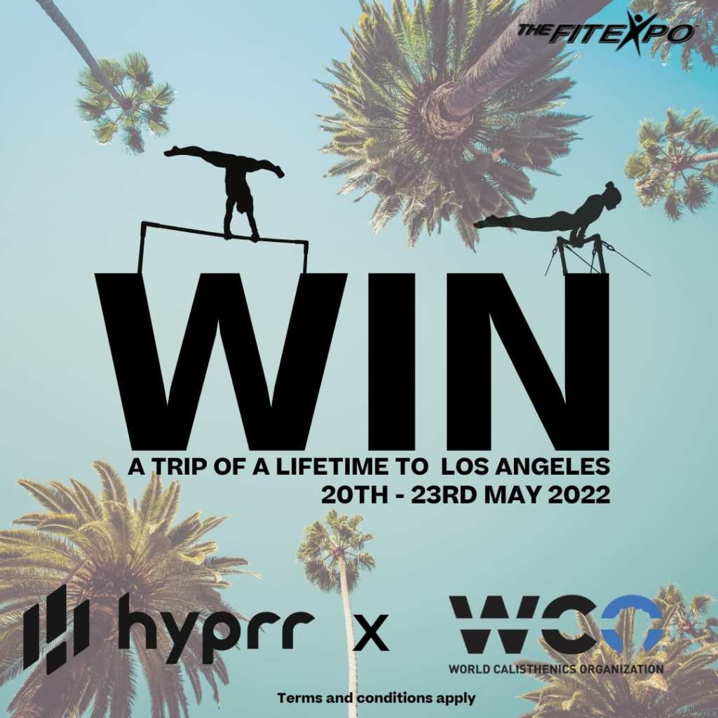 The prize is an all-expenses paid trip to Los Angeles for two lucky winners. The winners will fly to Los Angeles to attend the WCO – World Calisthenics Organization competition being held at The Fit expo this coming May. The Fit expo which takes place at the Los Angeles Convention centre on May 21st -22nd will attract 88,000 people over the two days and WCO takes centre stage.